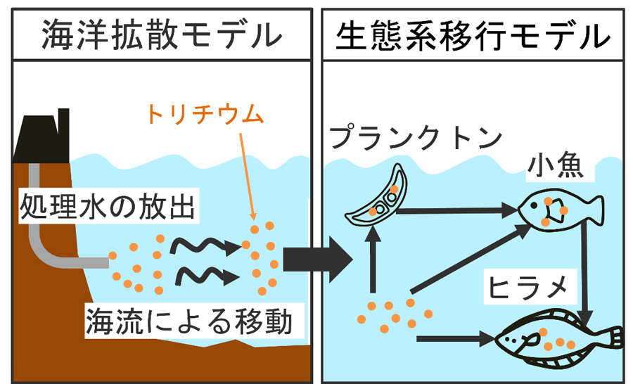 本研究では、福島近海におけるALPS処理水中のトリチウムの動きについて精緻な計算ができるシミュレーションモデル「海洋拡散モデル」を活用し、時空間的に連続した海水中の分布状況の推定を可能にしました。さらに、このモデルに海水から生態系へのトリチウムの移行を計算する「生態系移行モデル」を組み合わせることで、海産物についても時空間的に連続した濃度推定が可能になりました。推定の結果、ALPS処理水の影響下にあるヒラメを継続的に摂取したとしても、ALPS処理水由来のトリチウムによる人体への影響はほとんどないことが分かりました。
