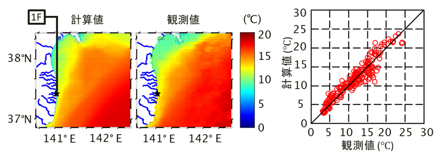 推定結果の妥当性を検証するため、海況の代表的指標である海水温について、計算値と観測値を比較しました。検証の結果、観測値と良く一致することが確認されました(図3)。これは、本研究による推定が海水中のトリチウムの動きを含む海況を適切に再現していたことを意味します。