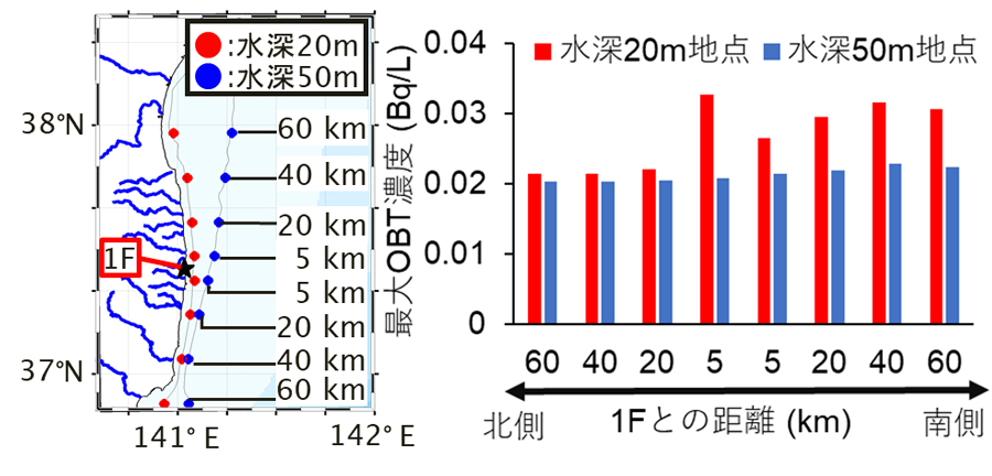 図4 各評価地点(左)に生息するヒラメに含まれる最大OBT濃度の推定結果(右)