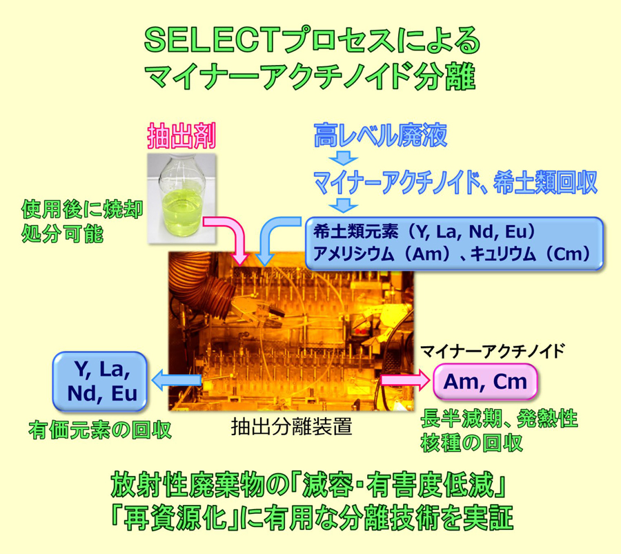 日本原子力研究開発機構は長い半減期を持つ元素を選択的に分離し、短い半減期または安定な核種へと変換する「分離変換技術」の実用化を目指しており、溶媒抽出法※3を適用した分離プロセスである「SELECTプロセス(Solvent Extraction from Liquid-waste using Extractants of CHON-type for Transmutation)」の開発を進めています。