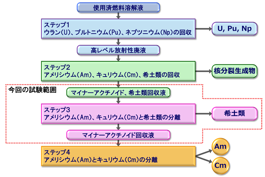 このうち、ステップ1および2については、過去に実施した核燃料物質と高レベル廃液を用いた実験で技術的成立性を示す結果を得ています。そこで今回の研究では、SELECTプロセスの枢要技術であるマイナーアクチノイドと希土類元素(イットリウム、ランタン、ネオジム、ユウロピウム)を分離するステップ3の成立性を実証するため、高レベル放射性廃液を用いた連続抽出試験を行いました。