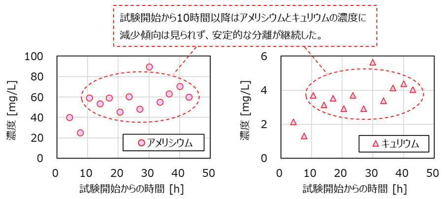 図3 ミキサセトラ型抽出器から排出されるアメリシウム(左)とキュリウム(右)の濃度の変化