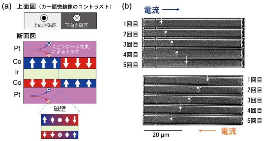 図1. (a) Pt / Co / Ir / Co / Pt人工反強磁性体の積層構造の模式図および期待されるカー顕微鏡像のコントラスト。(b)細線に対し電流を左から右に流した場合と、右から左に流した場合のカー顕微鏡像。白い矢印が磁壁位置を示しており、パルス状の電流の印加回数(1回目から5回目)に依存して磁壁位置が移動している様子がわかる。