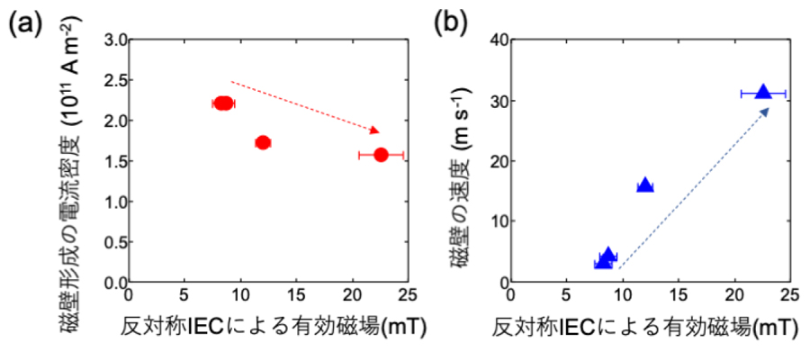 さらに、Co層の層厚を傾斜させて膜面内に構造の非対称性を付与することにより、反対称の層間交換結合によって新たな有効磁場を作り出すことに成功しました。そして、この有効磁場が増えると磁壁を生成するための電流密度が低減し(図2(a))、一方で磁壁速度は増加すること(図2(b))を見出しました。この結果は、反対称の層間交換結合を活用することによって、小さな電流で速く磁壁を移動できることを意味しています。
