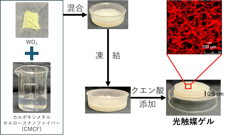 本研究では、カルボキシメチルセルロースナノファイバー(CMCF)に太陽光でも機能するモデル光触媒である酸化タングステン(WO3)を混ぜて、凍結後にクエン酸溶液に漬けて解凍する「凍結架橋法」で、光触媒ゲルを合成しました。一般に、WO3のような金属酸化物をハイドロゲル内に均一に固定するのは難しいとされています。研究チームは、CMCFのかき混ぜると柔らかく、静置すると固まる性質を利用し、WO3を分散した状態で固定しました。
