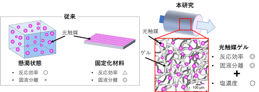 従来の粉末状や薄膜状の光触媒材料(図1左)は、溶液中の塩(えん)イオンによる粒子の凝集や反応の阻害により、有機物の分解効率が大幅に低下することが知られています。