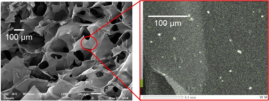 走査型電子顕微鏡-エネルギー分散型X線分光(SEM-EDX)観察を行いました。合成した光触媒ゲル内部には100〜200 µm規模の流路が形成され、その内壁にはWO3粉末が均一に固定されていることを確認しました(図2)。また、光触媒ゲル全体でWO3微粒子がどの程度の塊で固定されているか、原子力機構の研究用原子炉JRR-3 [5]に設置されている中性子小角散乱装置(SANS-J, PNO)[6]で解析しました。その結果、SEM-EDXで観察したごく一部だけでなく、全体にわたりWO3粒子が大きな塊にならずに固定されていることが明らかになりました。これにより、有機汚染物質が光触媒と効率的に接触できる反応場が形成されたと推察しました。
