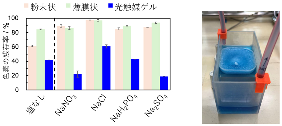 図3 粉末状、薄膜状、光触媒ゲルの水中でのインジゴカルミン色素残存率(反応後の色素濃度)の比較(左)と、色素分解実験の様子(右、光照射前)