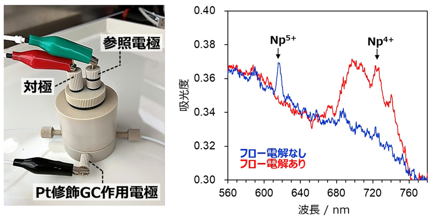 Npは通常5価で存在し、フロー電解セル(左)に通すと4価に変換される。変換割合は最大99%だった