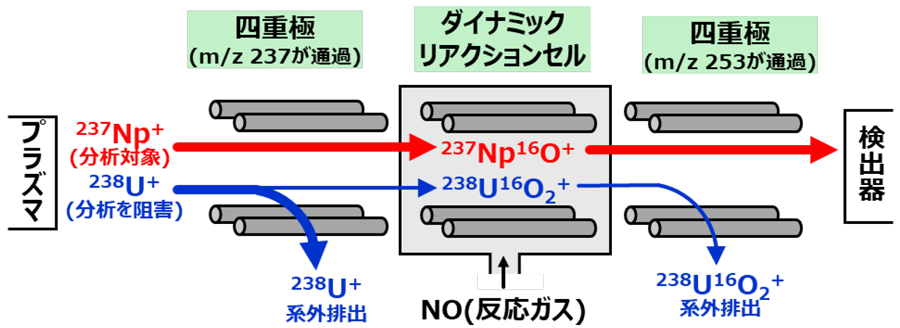 そこで、本システムは分析装置内でもUをさらに除去できるように、質量分離とガス反応を利用した「マスシフト法」による分離スキームを備えています(図4)。ICP-MS/MSの質量分離部は、ダイナミックリアクションセルと、それを挟みこむように2つの四重極が配置されています。1つ目の四重極はm/z 237のみ、2つ目の四重極はm/z 253のイオンのみが通過するように設定し、ダイナミックリアクションセルには一定量のガス(ここでは一酸化窒素(NO))を流しておきます。プラズマによってイオン化した237Np+(m/z 237)は、1つ目の四重極を通過した後、NOと反応して237Np16O+(m/z 253)になり、2つ目の四重極を通過して、検出されます。一方、238U+(m/z 238)は1つ目の四重極を通過できず、ごくわずかに通過したとしても238U16O2+(m/z 270)になり、2つ目の四重極を通過できず、除去されます。固相抽出とこの分離スキームを組み合わせることで、237Npの27万倍のUが存在したとしても分離が可能です。