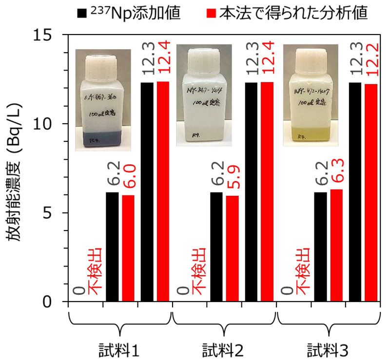 放射性廃液試料への237Np添加量を変えながら分析を行った。いずれでも期待値(黒)に対して分析値(赤)はよく一致し、237Npを正確に分析できたことを示す