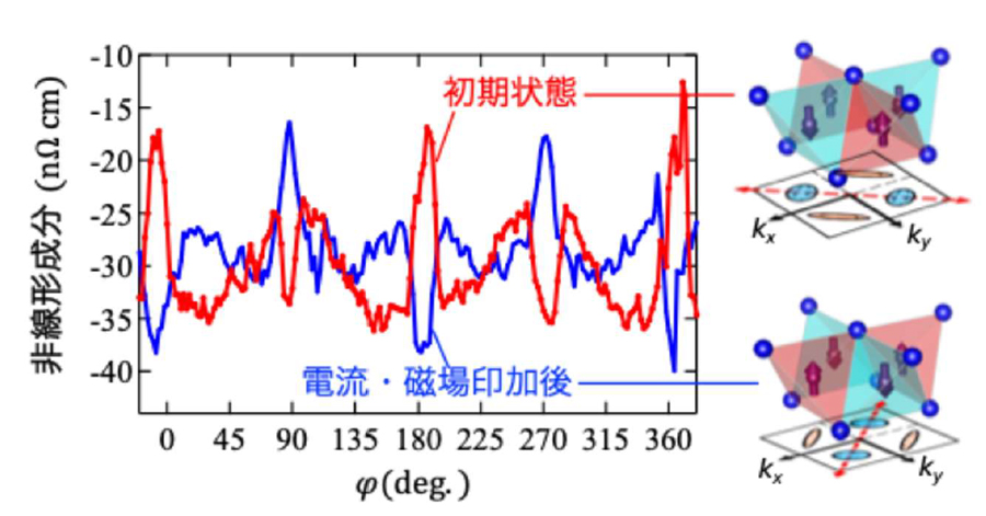 東北大学金属材料研究所の酒井英明教授(研究開始時:大阪大学大学院理学研究科)、宮本雄哉氏(研究当時:大阪大学大学院理学研究科)、日本原子力研究開発機構の木俣基研究副主幹(研究開始時:東北大学金属材料研究所)らは、時間・空間反転対称性のいずれも持たない反強磁性体SrMnBi2において、均一な電子の動きやすさ(電子状態)が電流により液晶のように特定の方向へ偏って歪むという新現象を、電気抵抗のダイオード的な成分として初めて検出することに成功しました。さらに、反強磁性パターンを電流と磁場で制御することでダイオード特性の極性反転にも成功しました。このスイッチング可能な現象は、革新的なメモリや整流素子としてエレクトロニクス応用が期待されます。