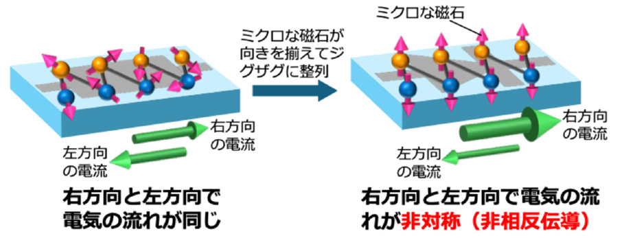 近年の研究で、ダイオードのように異なる物質同士を組み合わさずとも、物質内部に電気の流れ方に方向の偏りが生じる「電気の一方通行的な性質」、つまり、「非相反伝導」と呼ぶ現象が生じる可能性が、理論的に示されていました。物質内部の原子の並び方や電子が持つ磁石の性質(スピン)の配列が非相反伝導を発現させるというものです。