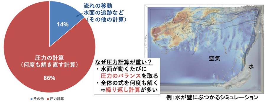 しかし、気体と液体の密度比が大きくなると、圧力計算の安定性が悪化し、解に収束するまで圧力を解き直す繰り返し計算が増大し、大半の計算時間を占めるようになります(図3)。この結果、計算時間が長くなり、大規模な解析を行う際の制約となっていました。