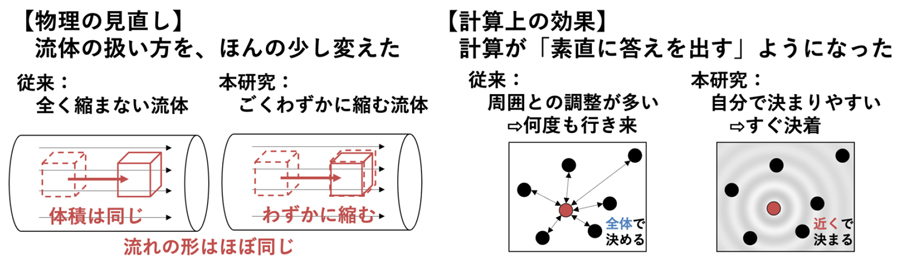 本研究では、この計算上の課題に着目し、流体モデルの定式化そのものを見直しました。従来のように流体を「まったく縮まない」と扱うのではなく、実際の流れに存在する「ごくわずかな縮み」をあえて残す「弱圧縮性モデル」と呼ばれる新しい計算手法を導入しています(図4)。この変更により、圧力計算の安定性が大きく向上しました。