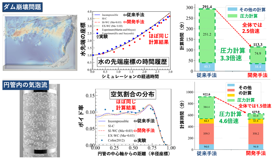 ごくわずかに縮む流体を考えることで圧力の修正が比較的近い領域に限定されるようになり、計算領域全体を何度も調整する必要が減りました。その結果、圧力計算に必要な繰り返し回数が大幅に削減され、図5(上段)に示すダム崩壊計算では、従来の非圧縮性手法では251分かかっていた圧力計算を75分に短縮することができました。シミュレーションの大部分を占めていた圧力計算が高速化されたことにより、解析時間は291分から113分に短縮されました。重要な点は、得られる流れの結果が従来手法とほぼ同じであることです。つまり、解析結果の信頼性を維持したまま、計算効率だけを大きく改善できたことが、本研究の大きな成果です。他にも、多数の気泡のシミュレーションなどでも計算効率を大幅に改善できることが分かっています。