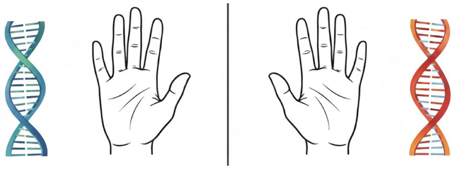 右手と左手は鏡映しの関係にあり、鏡に映さないと重ならない。DNAなどの多くの分子も同様に、互いに鏡映しの関係にあるペア(鏡像異性体)を持つ