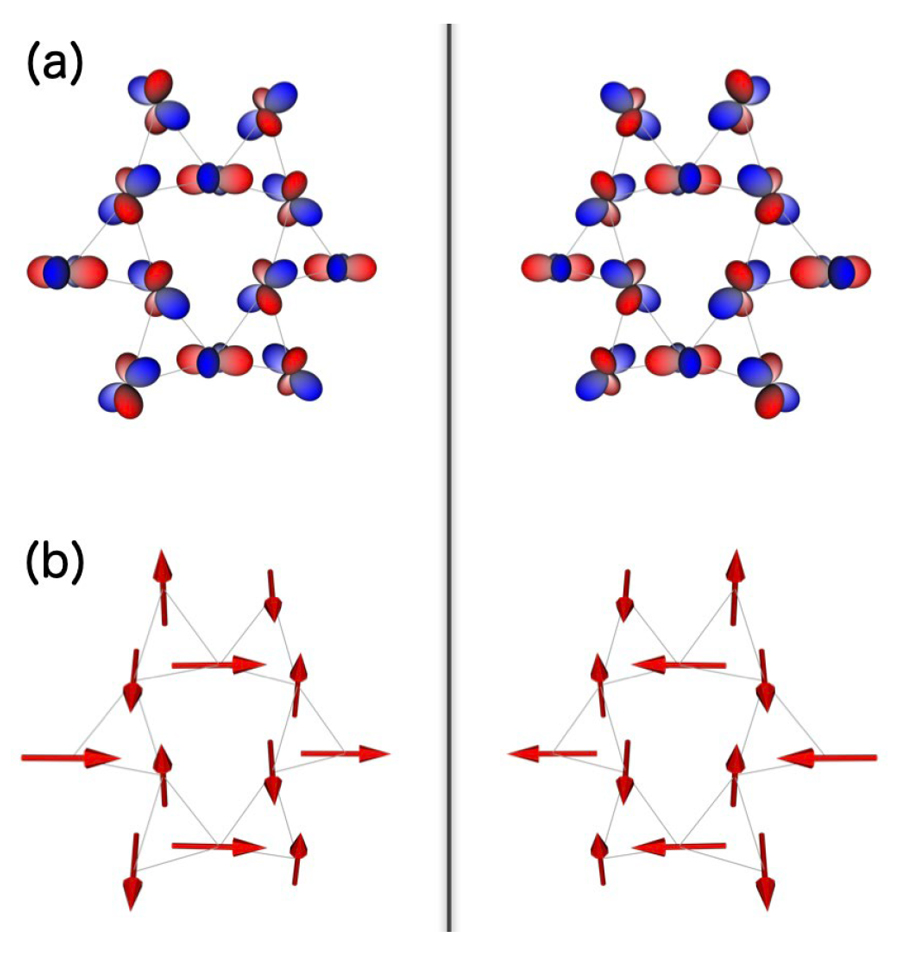 (a)純電子的カイラリティの例 青色と赤色は原子の周りでの電子の動きの偏りを表している。中心に引かれた黒線で鏡映しにすると、原子の位置は変わらず、電子の動きの偏りだけが逆転するカイラルな状態になっている