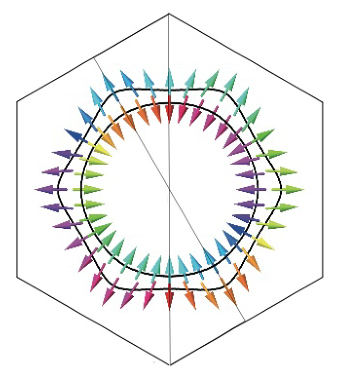 (b)紙面手前方向に磁場をかけた場合のスピンの分布 通常は紙面手前方向を向くが、(a)のような電気の偏りと結合して、スピンがひねられる