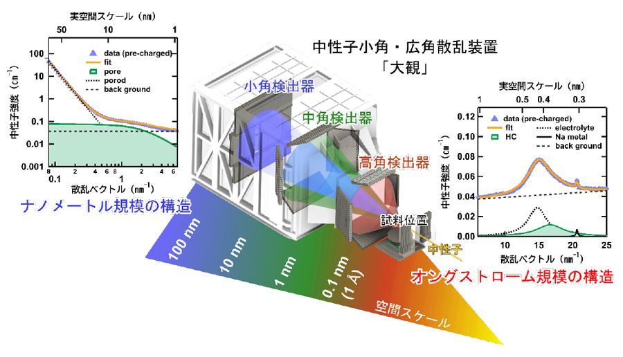 東北大学金属材料研究所 梅本 好日古 博士研究員(現 オークリッジ国立研究所 博士研究員)、総合科学研究機構(CROSS)中性子科学センター研究開発部 大石 一城 次長、河村 幸彦 技師、東京理科大学理学部第一部応用化学科 五十嵐 大輔 プロジェクト研究員、中本 康介 助教、駒場 慎一 教授、横浜国立大学大学院工学研究院 多々良 涼一 准教授、東京科学大学(Science Tokyo)総合研究院化学生命科学研究所 LIN Che-an 研究員、館山 佳尚 教授、日本原子力研究開発機構J-PARCセンター 廣井 孝介 研究副主幹、高田 慎一 研究副主幹、及び京都大学複合原子力科学研究所 南部 雄亮 特定教授の研究グループは、中性子を用いて、次世代の蓄電デバイスとして期待されるナトリウムイオン電池の負極材料「ハードカーボン(※1)」において、ナトリウムが負極に挿入されるプロセスを世界で初めてリアルタイムかつマルチスケールでの観測に成功しました。 本研究では、大強度陽子加速器施設(J-PARC)物質・生命科学実験施設(MLF)(※2)に設置された中性子小角・広角散乱装置「大観」(※3)を用い、電池を充放電させながら内部を観察する「オペランド測定」を実施しました。その結果、ナトリウムが炭素の「表面や欠陥部分」、「層間」や「ナノサイズの隙間」へ順番に挿入されていく3段階のメカニズムを特定することに成功しました。この成果は、資源制約のないナトリウムを用いた安価で高性能な次世代電池の開発に大きく貢献するものです。