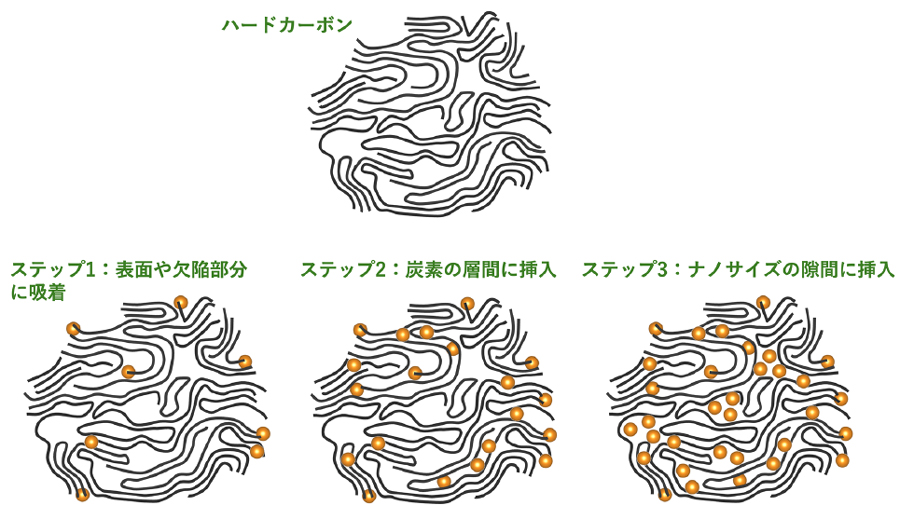 ステップ3 ナノサイズの隙間に挿入:最後に、炭素構造の中にあるナノサイズの隙間をナトリウムが満たしていきます。