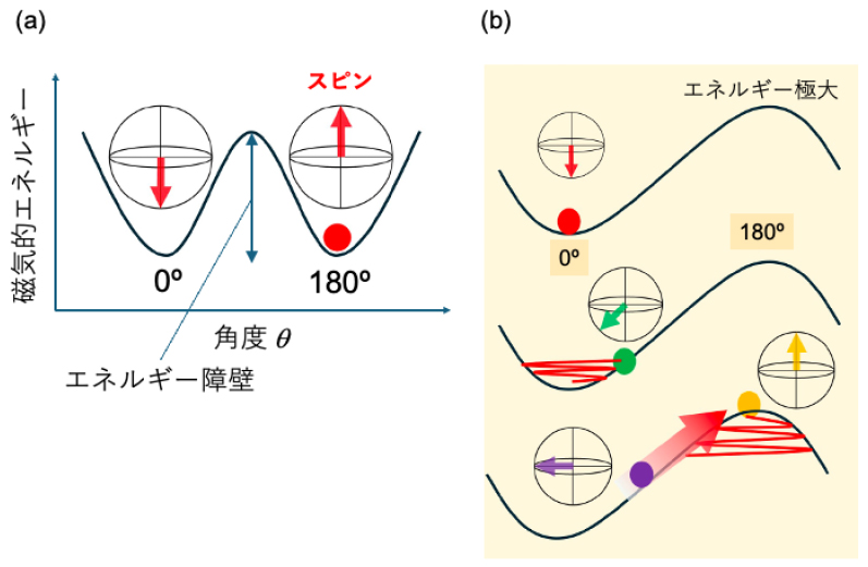一方で、磁気異方性が大きい場合、磁石に磁場や電流を印加してスピンの方向を変えるために、大きなエネルギーが必要となります。最先端のMRAMでは、素子に直接電流を通電して、磁石のスピンと伝導電子のスピンの相互作用によるスピントルク(注3)を使って磁化反転させますが、磁気異方性が大きいとスピントルクの効果が抑制される問題があり、スピントルクによってどのようなスピンの運動が励起され得るかについて全貌は未解明のままでした。