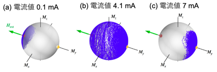 図2. 動的安定化が生じる過程におけるスピンの方位分布の計算結果。青線がスピンゆらぎの時間変化で、その密度がゆらぎの確率分布に対応する。電流値が(a) 0.1 mA、(b) 4.1 mAおよび(c) 7 mAの結果であり、4.1 mAではスピンのゆらぎが最大化されている。