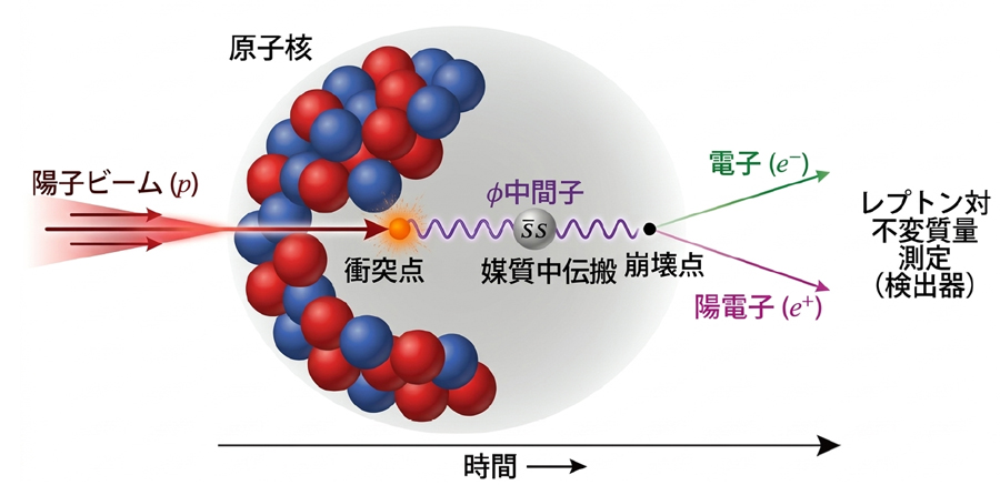 原子核標的中で陽子ビームによりφ中間子を生成。電子・陽電子対でφ中間子の生成を捉える。