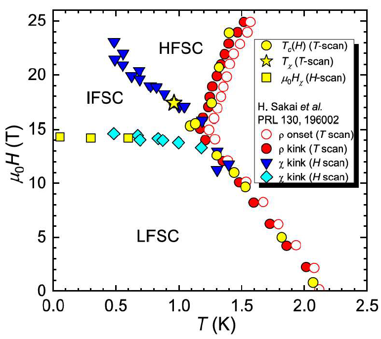 図2:磁場を結晶b軸に印可した時の超伝導相図。低磁場(LFSC)、中間磁場(IFSC)、高磁場(HFSC)超伝導