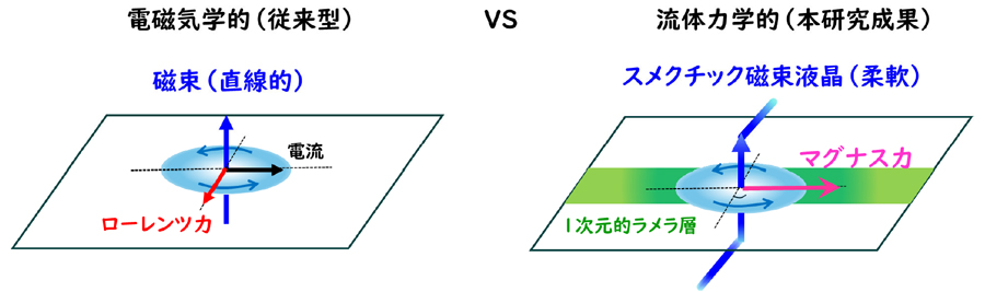 超伝導体に磁場を加えると、内部には磁束と呼ばれる糸状の量子渦*5が侵入します。通常、この磁束は比較的剛直な線として振る舞い、電流を流すと電磁気学的なローレンツ力*6によって動く「磁束フロー」が生じます。一方、磁束の周囲には超伝導電流が循環しているため、流体中の渦と同様に流体力学的なマグナス力が働く可能性が理論的に指摘されてきましたが、その寄与を実験的に明確に示すことは困難でした。