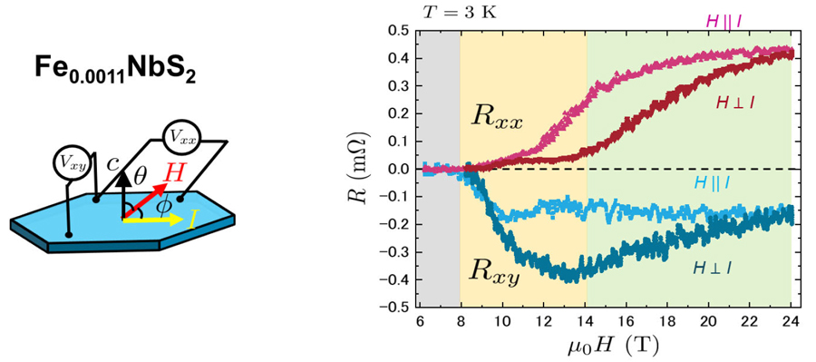 本研究では、少量の鉄(Fe)をドープしたNbS₂超伝導体を用いました。二次元伝導面に平行な磁場を印加することで、磁束が層状に配列するスメクチック磁束液晶状態を実現しました。この状態で電流と磁場の方向を精密に制御し、電流方向に生じる電圧(縦抵抗Rxx)と、それに直交する方向の電圧(ホール抵抗Rxy)を高精度に同時測定しました。これらの電圧信号は磁束の運動を直接反映するため、渦ダイナミクスやマグナス力の寄与を検出する手がかりとなります。主要な実験は、東北大学金属材料研究所・強磁場施設の25テスラ超伝導マグネットを用いて行いました。