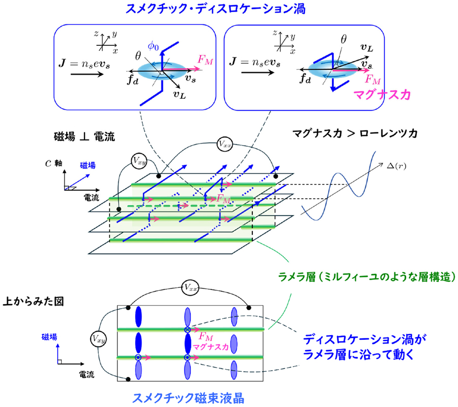 通常、磁束は比較的剛直な「ロープ」のように振る舞うため、電流によって生じるローレンツ力に支配された磁束フローとして理解されます。しかしスメクチック磁束液晶状態では磁束構造が柔軟化し、隣り合う磁束との再結合が容易に起こります。その結果、スメクチック磁束のつなぎ目によって形成されるラメラ層に沿って運動するトポロジカル欠陥「スメクチック・ディスロケーション渦」が生成されます。このディスロケーション渦は一次元的なラメラ層に拘束され、その方向に沿って運動するという特徴を持ちます。この幾何学的拘束により、渦に働くマグナス力の効果が顕著に現れ、電流方向に平行な成分を持つ特異な渦運動が誘起されます(図2)。これは従来の磁束フローでは想定されていない、トポロジカル欠陥によって媒介される集団ダイナミクスです。