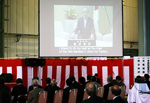 また、核融合エネルギー推進議員連盟会長の尾身財務大臣からビデオによる祝辞をいただき、将来の原型炉は日本に是非誘致させたい旨の心強いメッセージと励ましを頂きました。