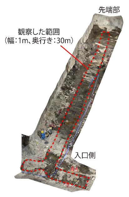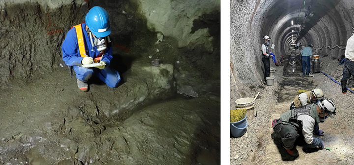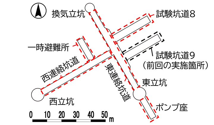 令和7年9月9日から10月15日にかけて、500m調査坑道の西連絡坑道、東連絡坑道、一時避難所及び試験坑道8(図-1の赤点線)において底盤部の清掃を行い、一部の範囲の岩盤を露出させて地質観察を行いました(図-2、図-3)。この観察は、令和7年6月に500m調査坑道の試験坑道9で実施した観察の続きに相当します。今回の観察でも、前回と同様に岩盤の割れ目の長さや割れ目同士のつながり具合、岩盤の強度などの地質学的特徴に関する情報を取得しました。これらの情報は、坑道周辺の岩盤内の割れ目の空間分布などを推定するために非常に重要な情報となります。また、得られた情報を整理することで、500m調査坑道全域に発達する断層の分布やその特徴の把握、坑道を掘削した際に坑道周辺に生じる割れ目の発達領域の推定など、さまざまな試験・調査に利用できます。