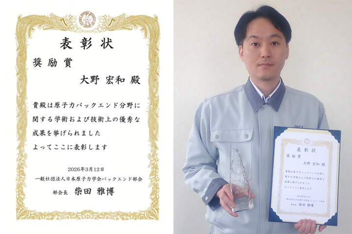 日本原子力学会2026年春の年会(令和8年3月11日~3月13日)において、2025年度バックエンド部会表彰が行われ、幌延深地層研究センター 大野 宏和 研究副主幹が奨励賞を受賞しました(写真)。