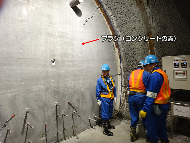 を行っています(温度、水分、応力、水質等のデータ取得)。コンクリートの壁(プラグ)の向こう側に模擬の人工バリアが埋設されています(図参照)。