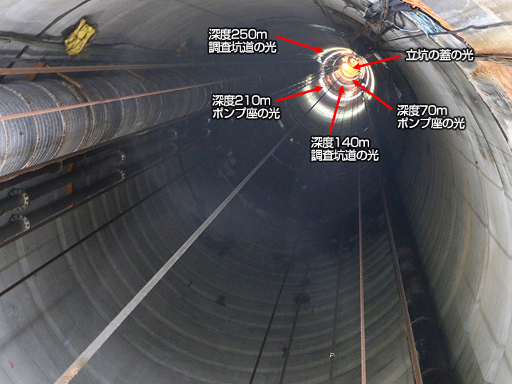 奥(上)の方に見える光の輪は、調査坑道、ポンプ座がある場所です。