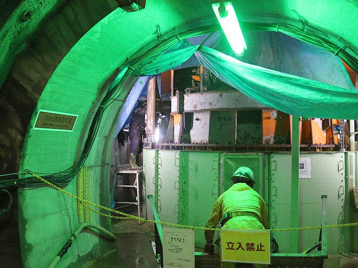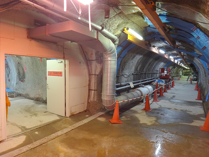 一番奥のオレンジ色に見える部分は立坑の蓋(開閉式の扉)で、資材を搬入するときに開閉します。