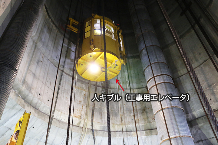 中央の黄色のカゴのような設備が、一般見学者の方も利用する人キブル(工事用エレベータ)です。