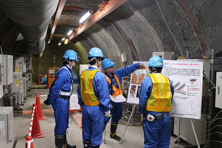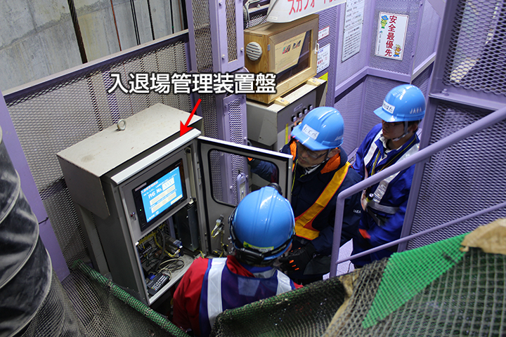 新たに地下施設での作業に従事する従業員に対し、教育(入退場管理装置の操作方法等)を行っている様子です。