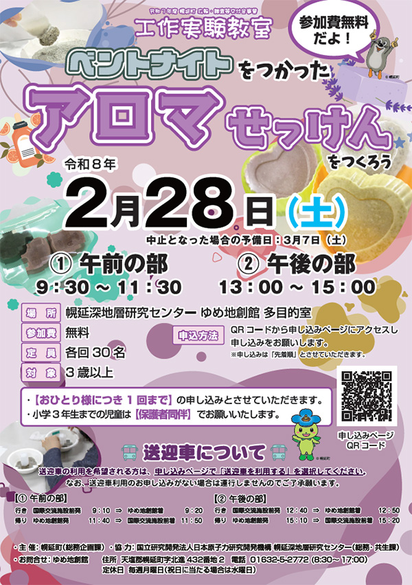 2月28日(土)工作実験教室「ベントナイトをつかったアロマせっけんをつくろう」を開催! 令和8年2月28日(土)に、幌延深地層研究センターゆめ地創館にて工作実験教室「ベントナイトをつかったアロマせっけんをつくろう」を開催します。 3歳以上から参加できますので、ご興味のある方はぜひご参加ください! 参加には事前申込が必要となりますので、下記ポスター(PDF 1.1MB)をご確認ください。 主催:幌延町 協力:国立研究開発法人日本原子力研究開発機構 幌延深地層研究センター 申込フォームはこちらになります。