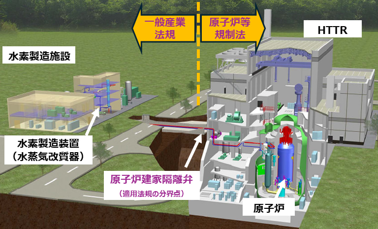 国の方針に基づき、日本原子力研究開発機構(JAEA)は経済産業省資源エネルギー庁の委託事業「高温ガス炉実証炉開発事業(超高温を利用した水素大量製造技術実証事業)」において、JAEAが有するHTTRに水素製造施設を新たに設置・接続し、原子炉の熱を直接利用して水素を製造する技術を確証するための研究開発を進めてきました。また、水素製造施設の原子炉への接続に向け、設置許可の基準への適合性に係わる技術評価等を行ってきました。
