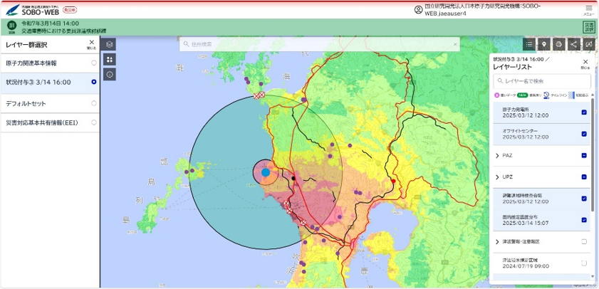 防災科学技術研究所と協力し、内閣府が令和6年度から運用を開始した新総合防災情報システム(SOBO-WEB)に、自然災害による交通機関等への被災状況や原子力災害対応に係る発災地点、避難対象となる区域等の情報を取り込み、時間経過に併せて進展させることでより現実的な状況に則した訓練を実施。