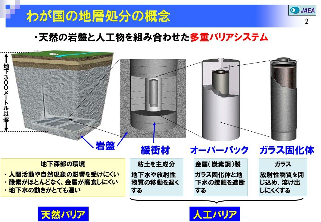 わが国の地層処分の概念は、ガラス固化体をオーバーパックと呼ばれる金属製の容器に封入したうえで、その外側を緩衝材と呼ばれる粘土で包み込んで、安定な岩盤の空洞内に埋設することとなっております。