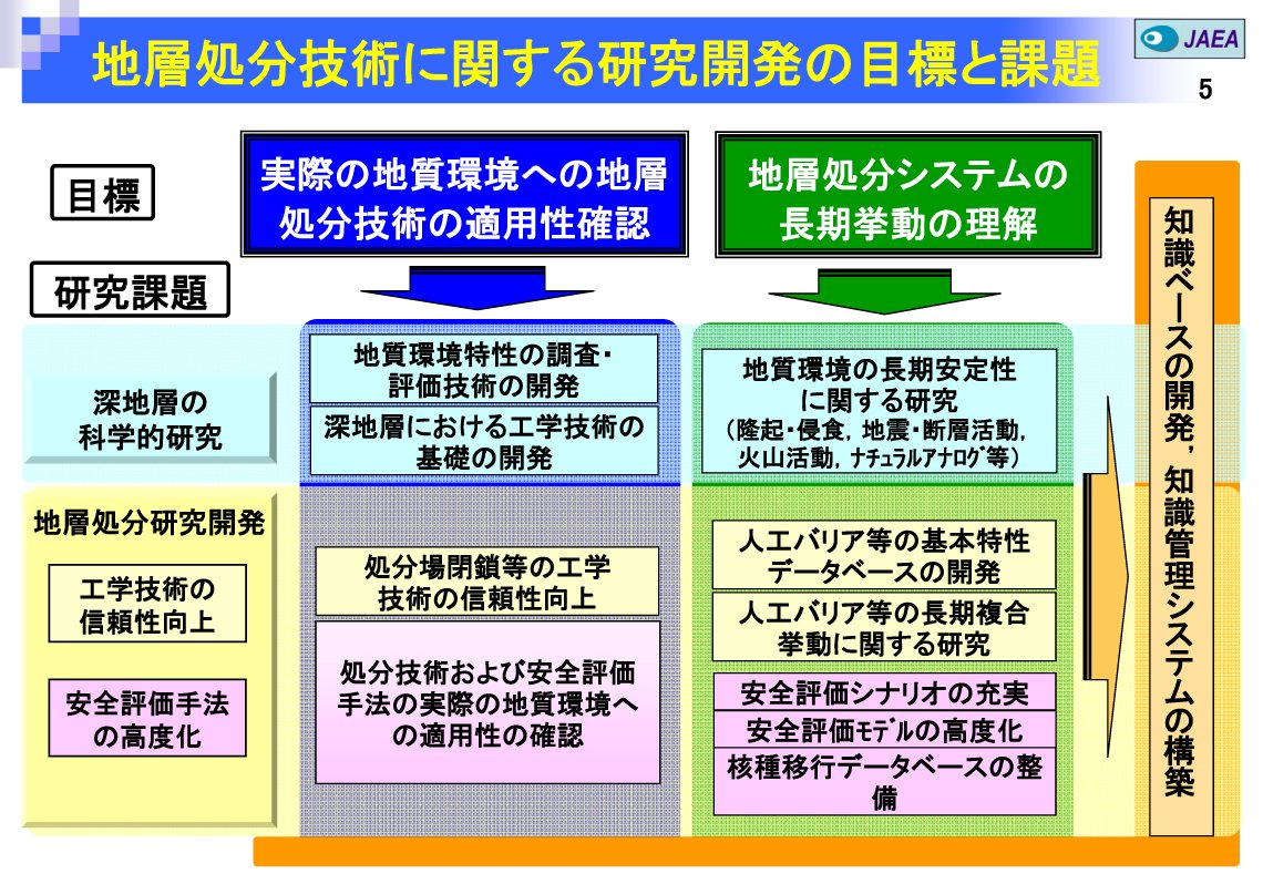 日本原子力研究開発機構では地層処分技術の信頼性をさらに高めていくという観点から、「実際の地質環境への地層処分技術の適用性確認」と「地層処分システムの長期挙動の理解」という2つの目標を掲げて、また、「地層処分研究開発」と「深地層の科学的研究」という2つの領域をもうけて研究開発を進めています。地層処分研究開発は、これら地層処分システムに関する「工学技術の信頼性向上」と「安全評価手法の高度化」を目指しており、深地層の科学的研究は、これら地層処分研究開発の基盤となるものです。