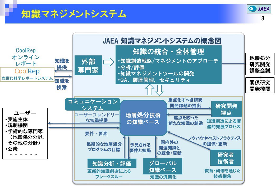 日本原子力研究開発機構では、個別の研究開発で得られた成果を、地層処分の安全性にかかわる論拠とできるように、国内外の知見とあわせて、総合的な知識ベースとして取りまとめ、伝達・継承していくための知識マネジメントシステム構築に向けた取り組みを進めています。