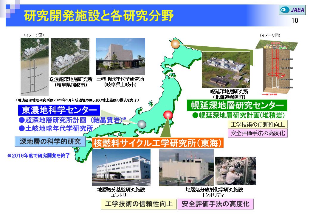 一方、岐阜県の東濃地科学センターでは、瑞浪市の瑞浪超深地層研究所において花崗岩を対象とした「深地層の科学的研究」を行ってきましたが、当初の研究開発目標を達成したため、令和元年度で研究開発を終了し、坑道の埋め戻し及び地上施設の撤去を完了しました。現在は、埋め戻し後の地下水環境モニタリング調査等を実施しています。また、土岐市の土岐地球年代学研究所において、「深地層の科学的研究」として、地質環境の長期安定性に関する研究を進めています。