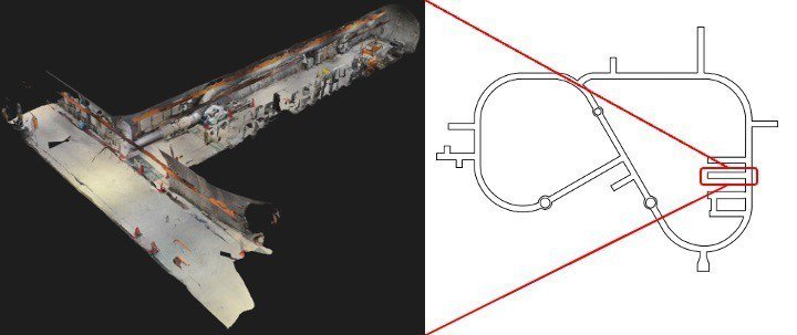 地下坑道内の視覚情報の取得では、幌延深地層研究センターの地下施設の350m調査坑道にある試験坑道3を対象として、LiDARセンサーによる深度情報とカメラによるRGB情報を組み合わせたフォトグラメトリを実施しました。得られた試験坑道3の3Dモデルを図1に示します。得られた3Dモデルを用いて、仮想現実空間上で試験坑道3内部を仮想的に歩行することができます。堆積岩を対象とした大深度掘削に伴う応力変化による亀裂の発生や、発生した亀裂を介した地下水の浸透といったマルチフィジックスシミュレーション技術による坑道周辺岩盤の損傷程度の解析結果(末武ほか, 2025)を用いて、得られた3Dモデルと重ね合わせたVR可視化を行いました。