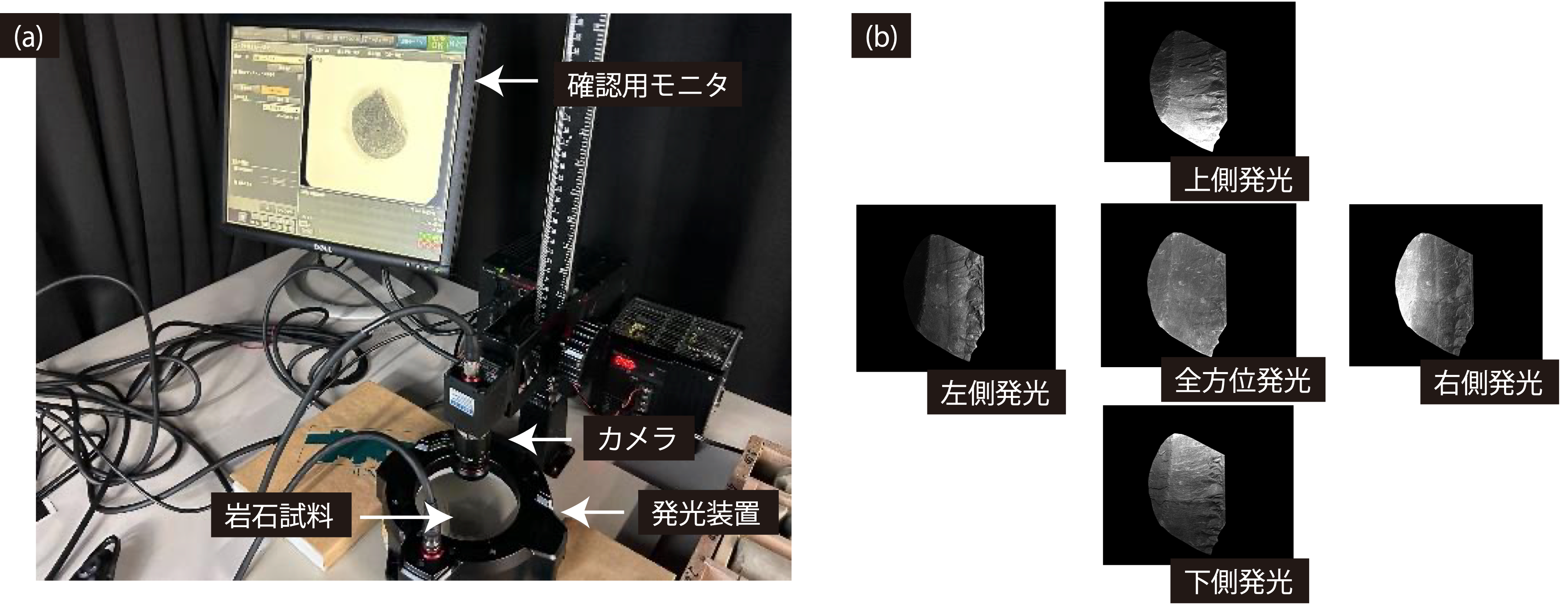 (a) 撮影の様子、(b) 割れ目面の撮影画像の例