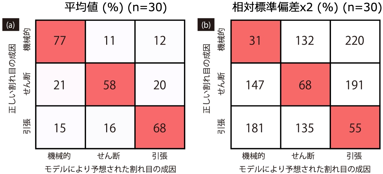 令和7年度は、北海道大学および秋田大学と共同で、堆積岩を対象としたボーリング調査から得られた岩石試料(岩石コア)を用いて、せん断や引張などの割れ目面の画像から深層学習により割れ目の成因を自動判別する技術の構築に引き続き取り組みました。せん断や引張を特徴付ける割れ目表面の凹凸を画像として認識しやすくするために、割れ目面に光を当てる方向を変えながら1つの撮影試料に対して複数の画像を取得しました(図2)。学習には、深層学習の一手法である転移学習を用いました。転移学習とは、事前学習済みモデルと呼ばれる、大規模データセットで学習されたモデルを活用する手法であり、学習データが少ない場合に有効とされています。本試みでは、取得した画像を入力として、事前学習済みモデルを用いた転移学習によって、学習を行いました。結果の一例として、モデルによる予測結果と正解の比較表(混同行列)を図3に示します。平均として、58%〜77%の正解率が得られましたが(図3a)、ばらつきの大きい結果となりました(図3b)。ばらつきの大きい要因として、割れ目の成因を特徴付ける岩石試料の割れ目面表面上の微細な凹凸構造が、モデル構築の際の情報量の圧縮により削ぎ落とされてしまっている可能性などが示唆されました。